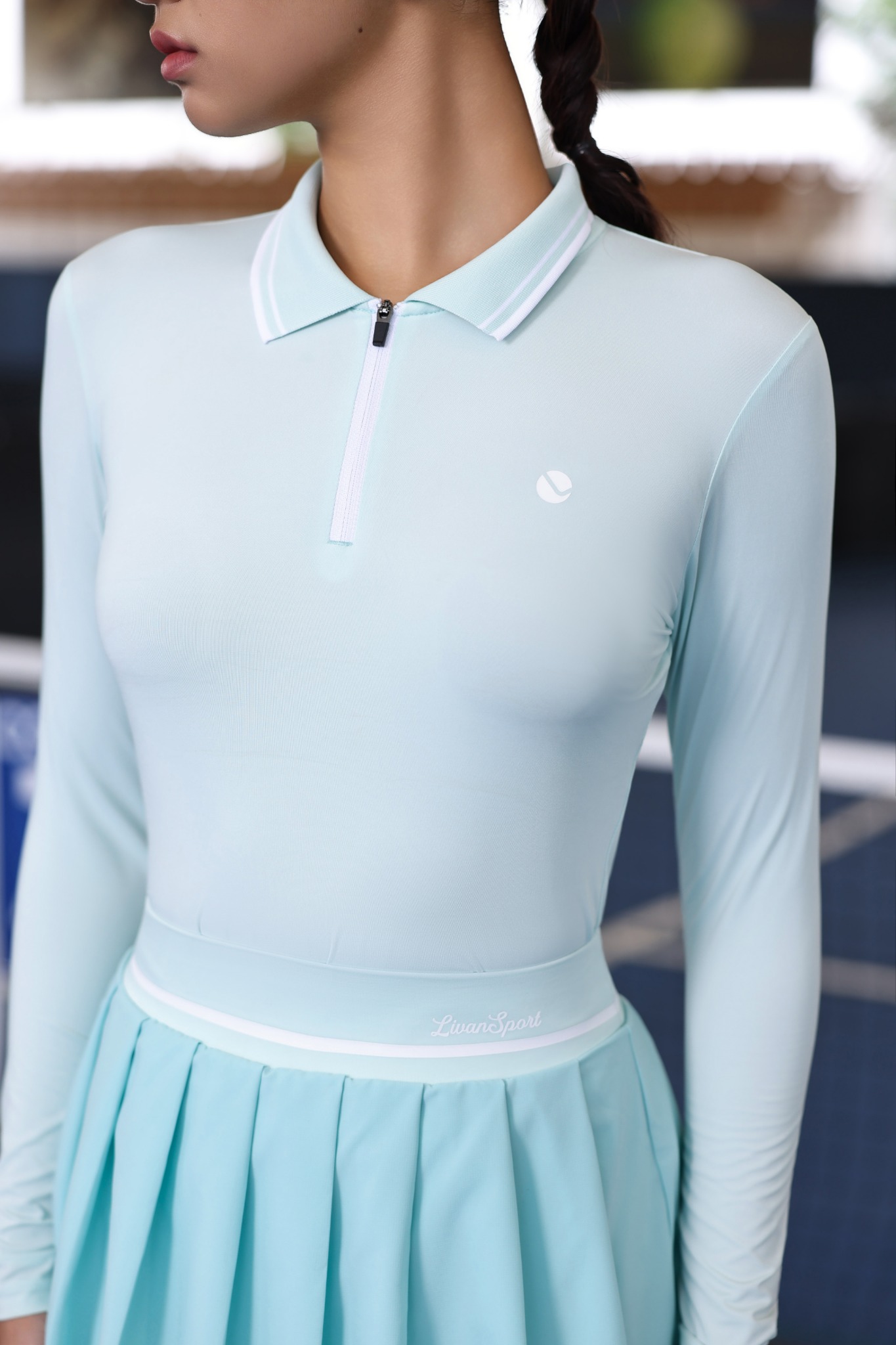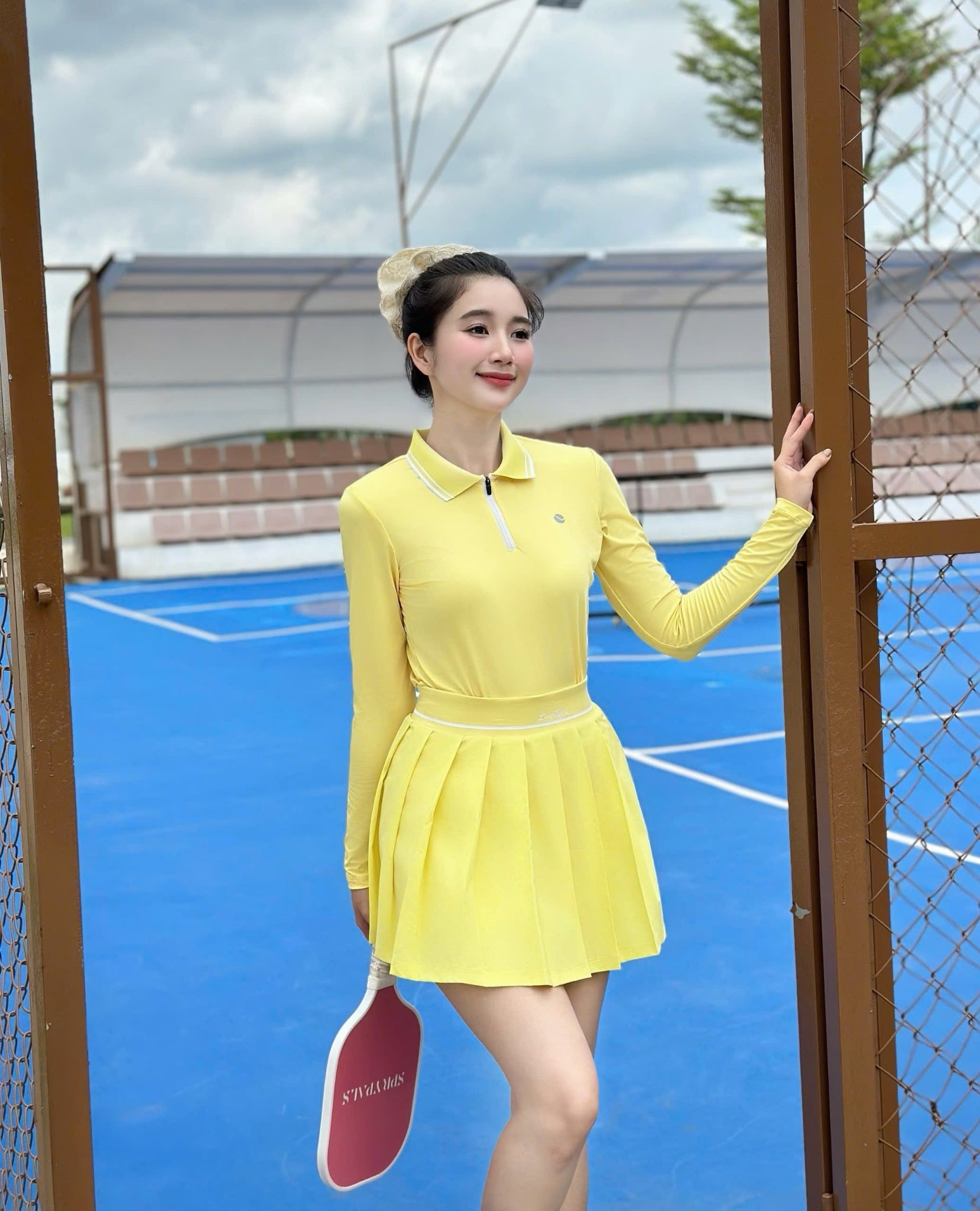 Phần tay áo dài giúp che nắng nhẹ nhàng khi chơi thể thao ngoài trời, đồng thời tôn lên vẻ thanh mảnh của cánh tay. Từng đường may đều gọn gàng, chắc chắn, thể hiện kỹ thuật may cao cấp – một điểm cộng khiến chiếc áo luôn giữ được phom dáng chuẩn dù bạn mặc suốt cả ngày.
