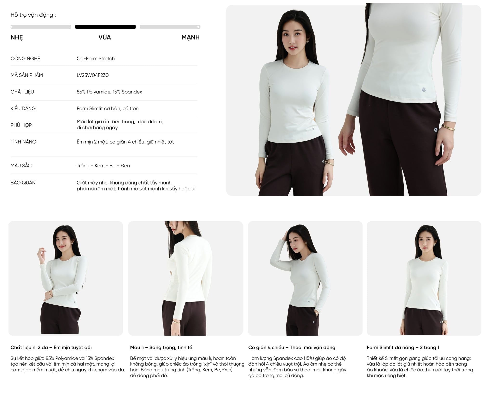 Sản phẩm được dệt từ 85% Polyamide và 15% Spandex, mang lại kết cấu vải êm mịn cả hai mặt (trong và ngoài), tạo cảm giác mềm mượt tuyệt đối khi tiếp xúc với làn da, không gây ngứa.