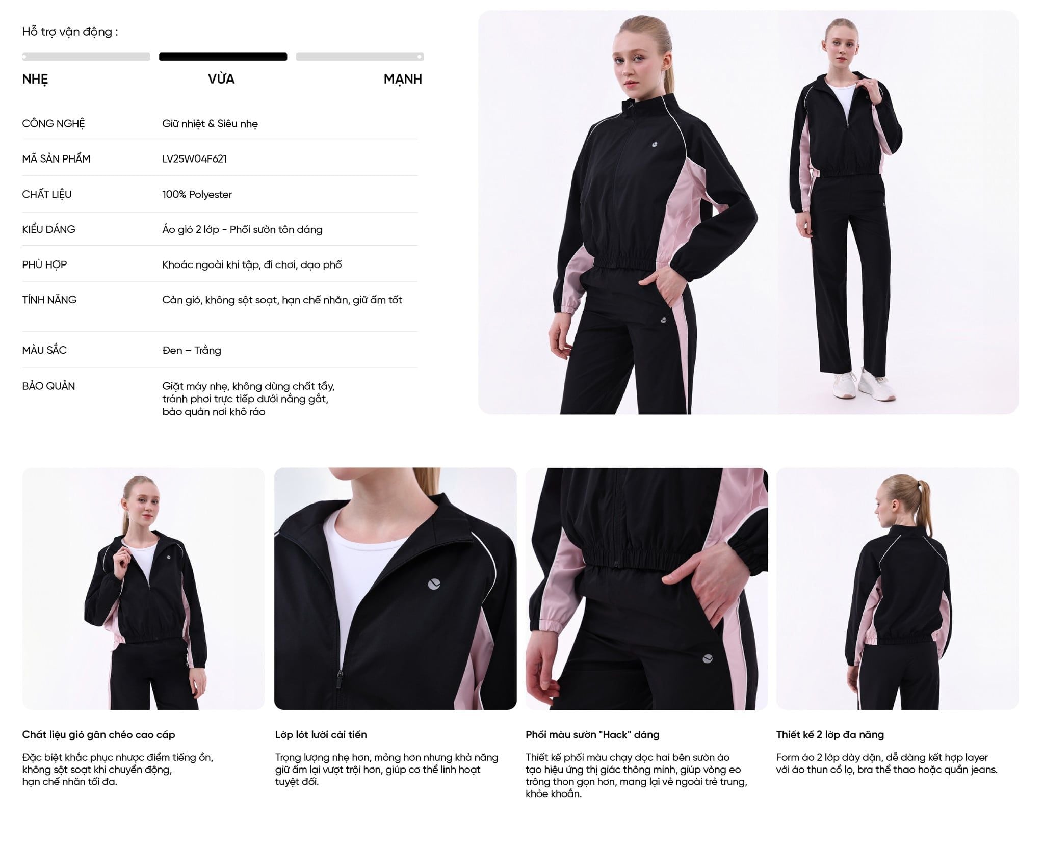Áo gió nữ LV25W04F621 là lựa chọn hoàn hảo cho cô nàng yêu phong cách thể thao nhưng vẫn muốn vẻ ngoài thon gọn, trẻ trung. Thiết kế phối màu chạy dọc hai bên sườn áo tạo hiệu ứng thị giác thông minh, giúp tôn dáng và đánh lừa thị giác vòng eo thon gọn hơn. Form áo 2 lớp dày dặn nhưng vẫn giữ phom tốt, dễ kết hợp cùng áo bra, quần legging hay quần jogger để tạo nên phong cách năng động nhưng vẫn tinh tế trong từng hoàn cảnh.