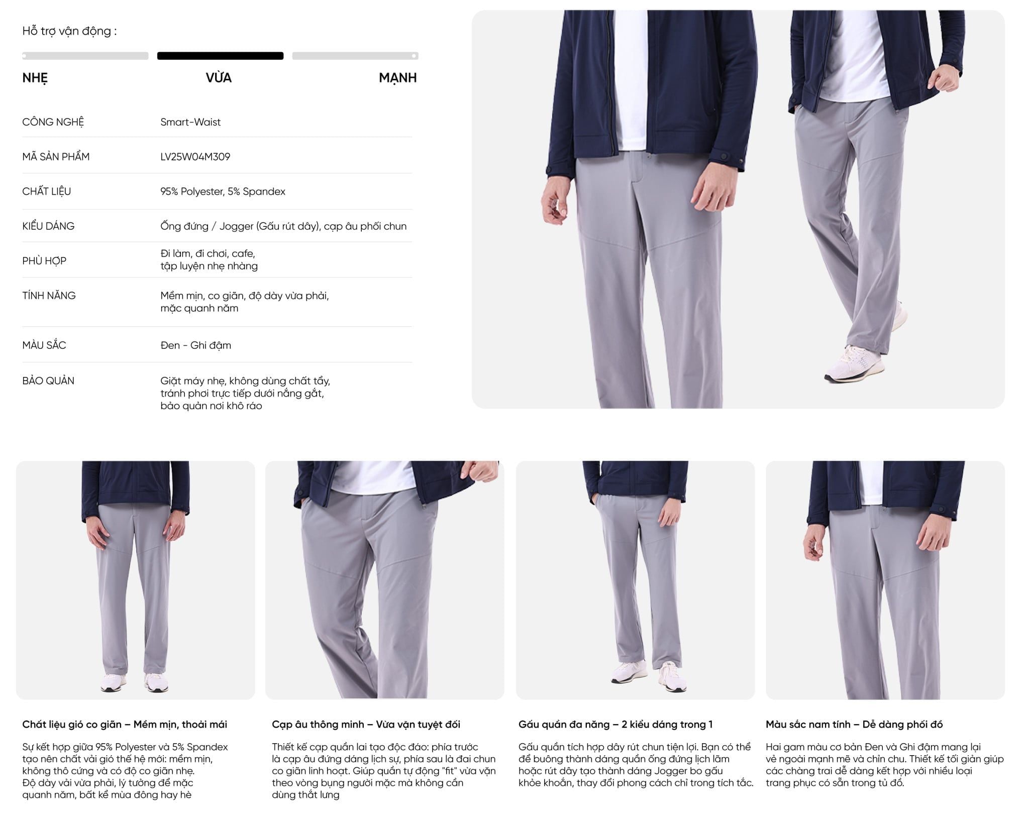 Quần dài nam LV25W04M309 là sự kết hợp hoàn hảo giữa vẻ chỉn chu của quần âu và sự thoải mái của quần thể thao. Thiết kế cạp quần lai tạo độc đáo: mặt trước phẳng phiu lịch sự, mặt sau là đai chun co giãn giúp tự động ôm vừa vặn theo vòng bụng mà không gây gò bó. Gấu quần tích hợp dây rút thông minh cho phép người mặc chuyển đổi linh hoạt: từ dáng ống đứng sang trọng sang dáng Jogger năng động chỉ trong tích tắc.