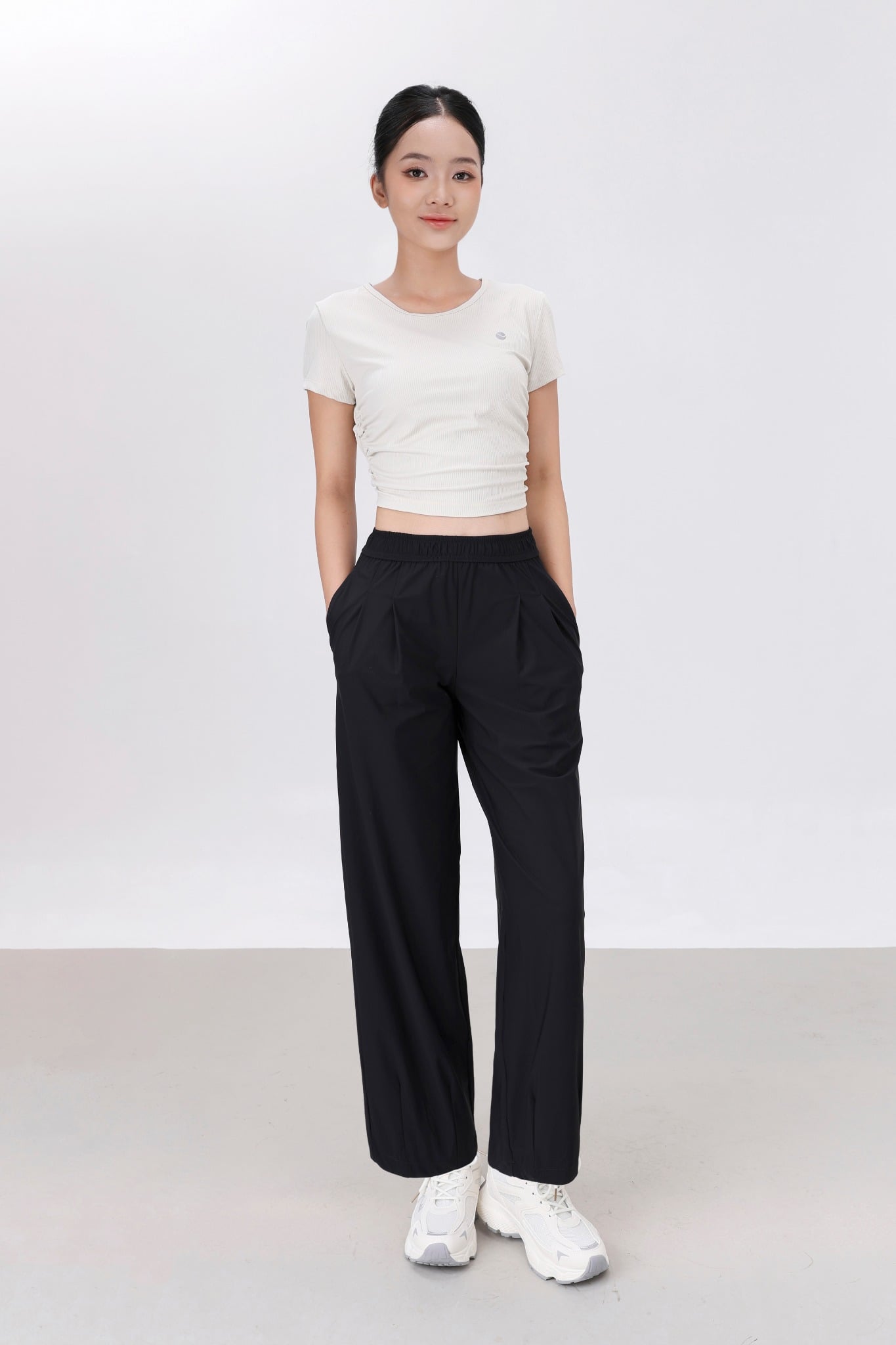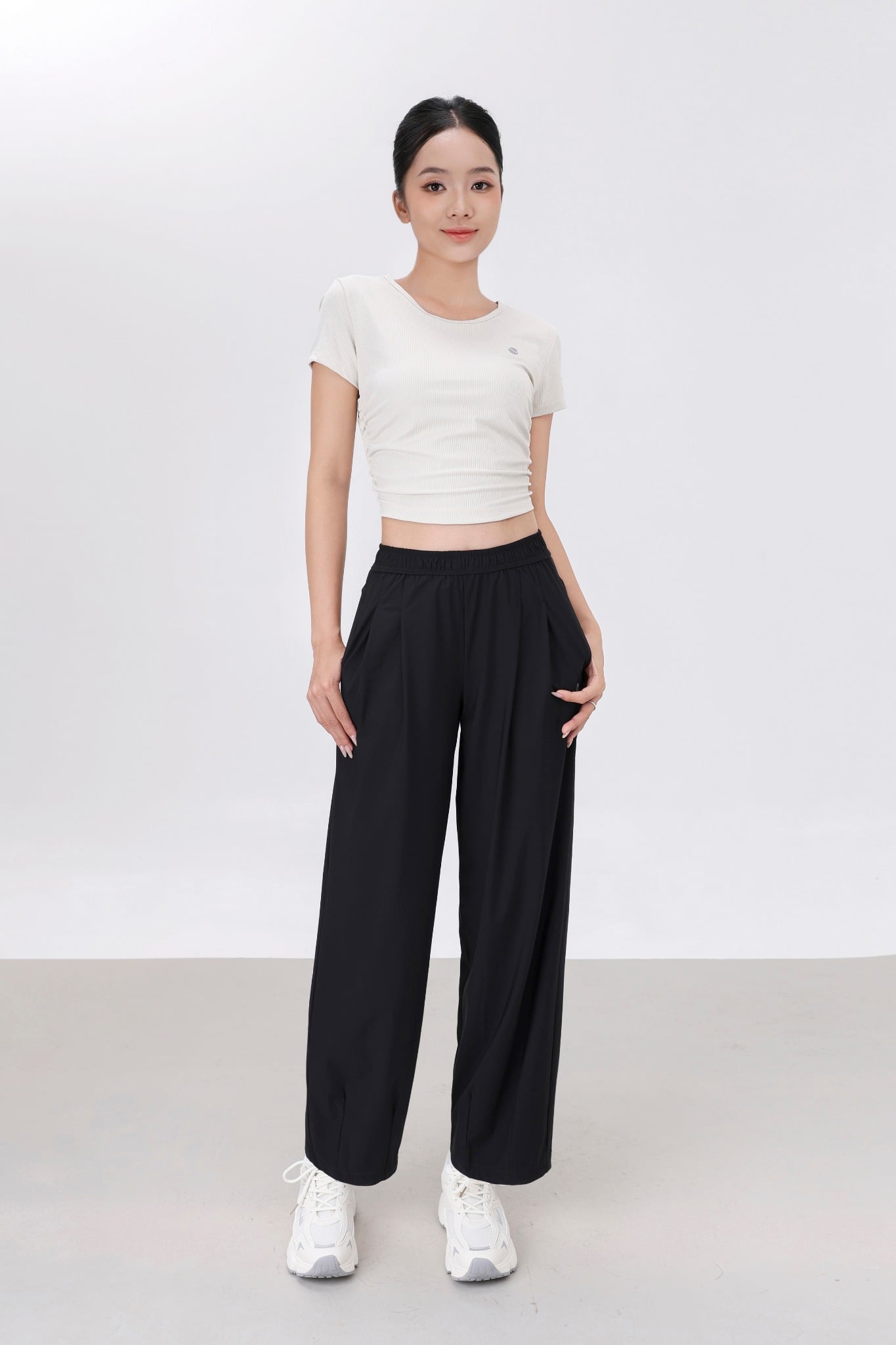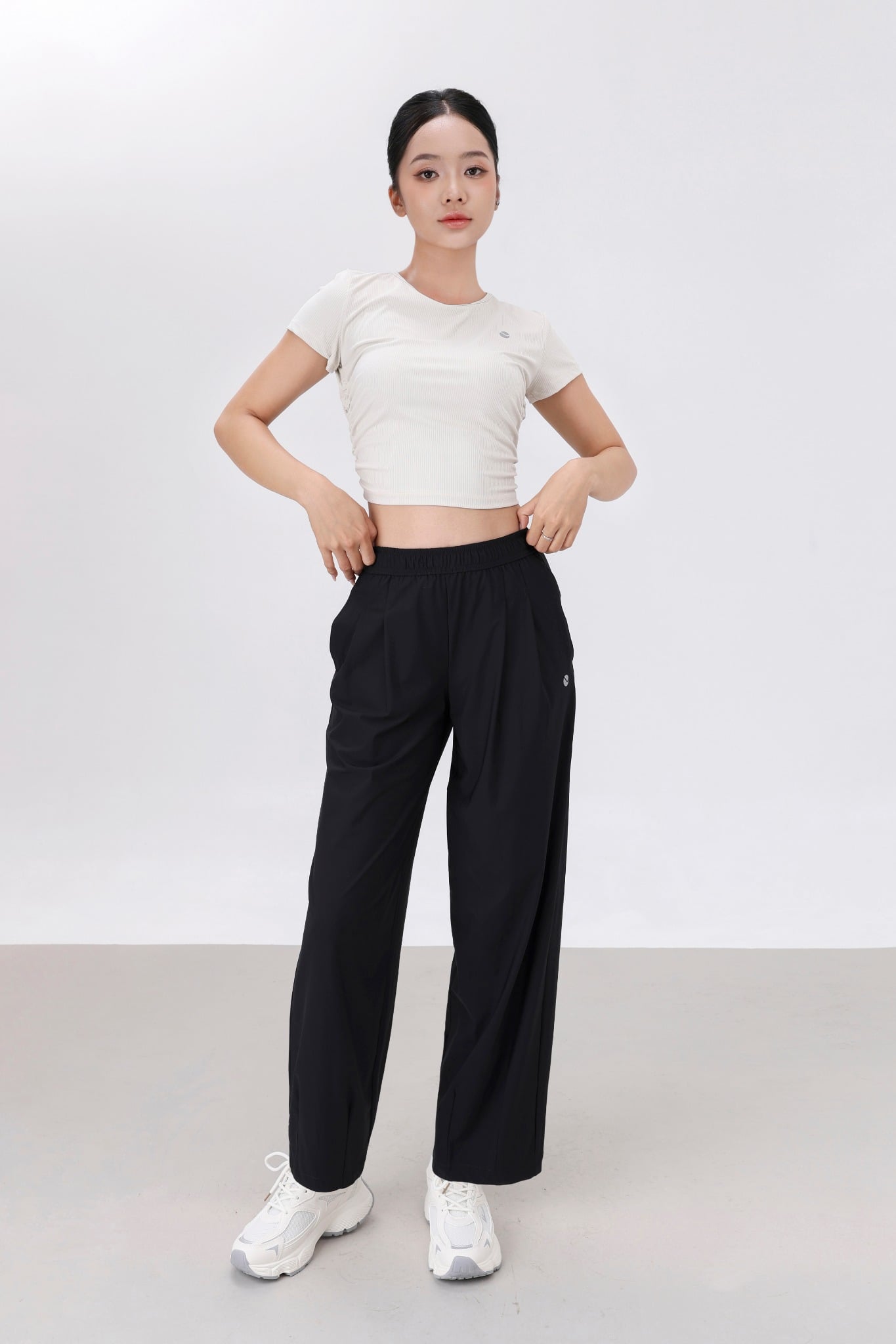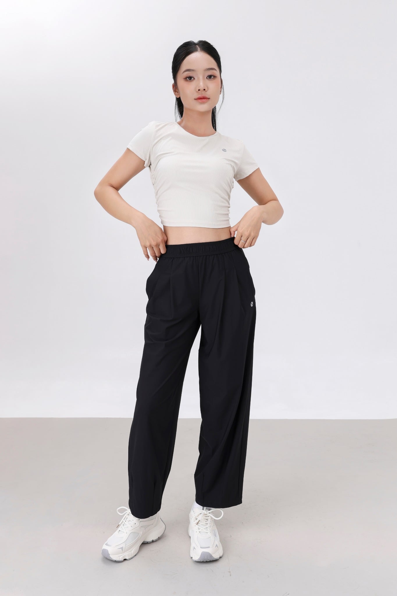 Đi chơi: quần dài LV25W04F308 + áo croptop + sneaker → năng động, trẻ trung.