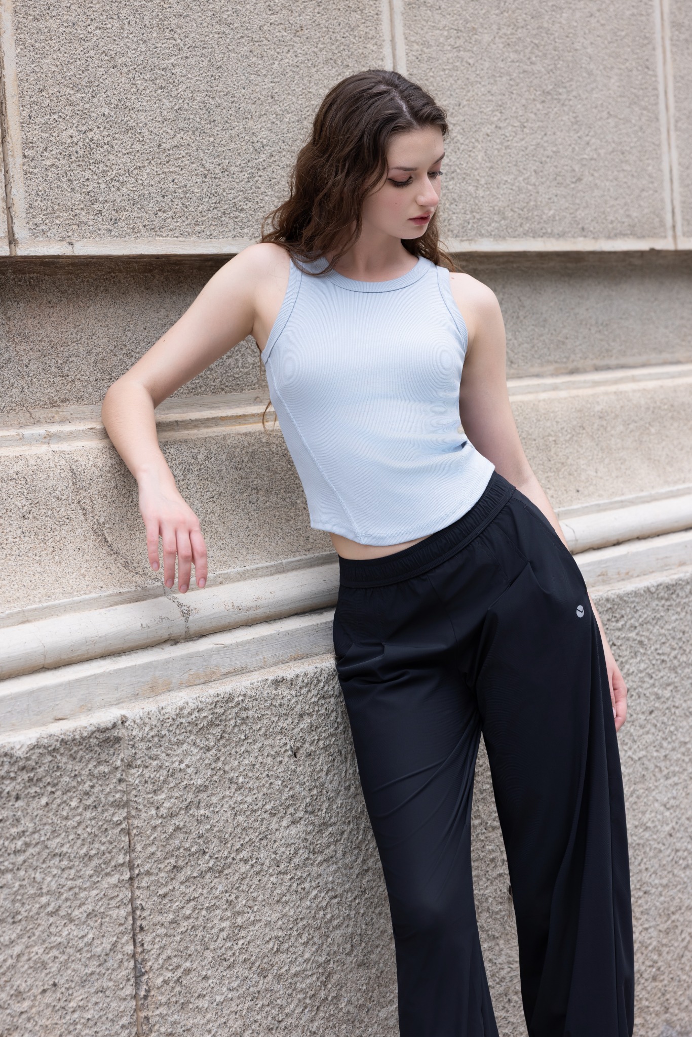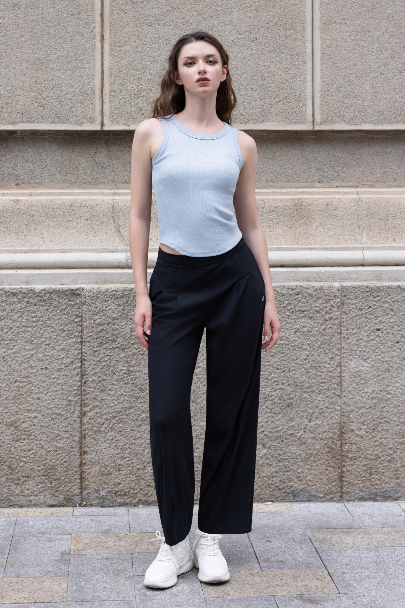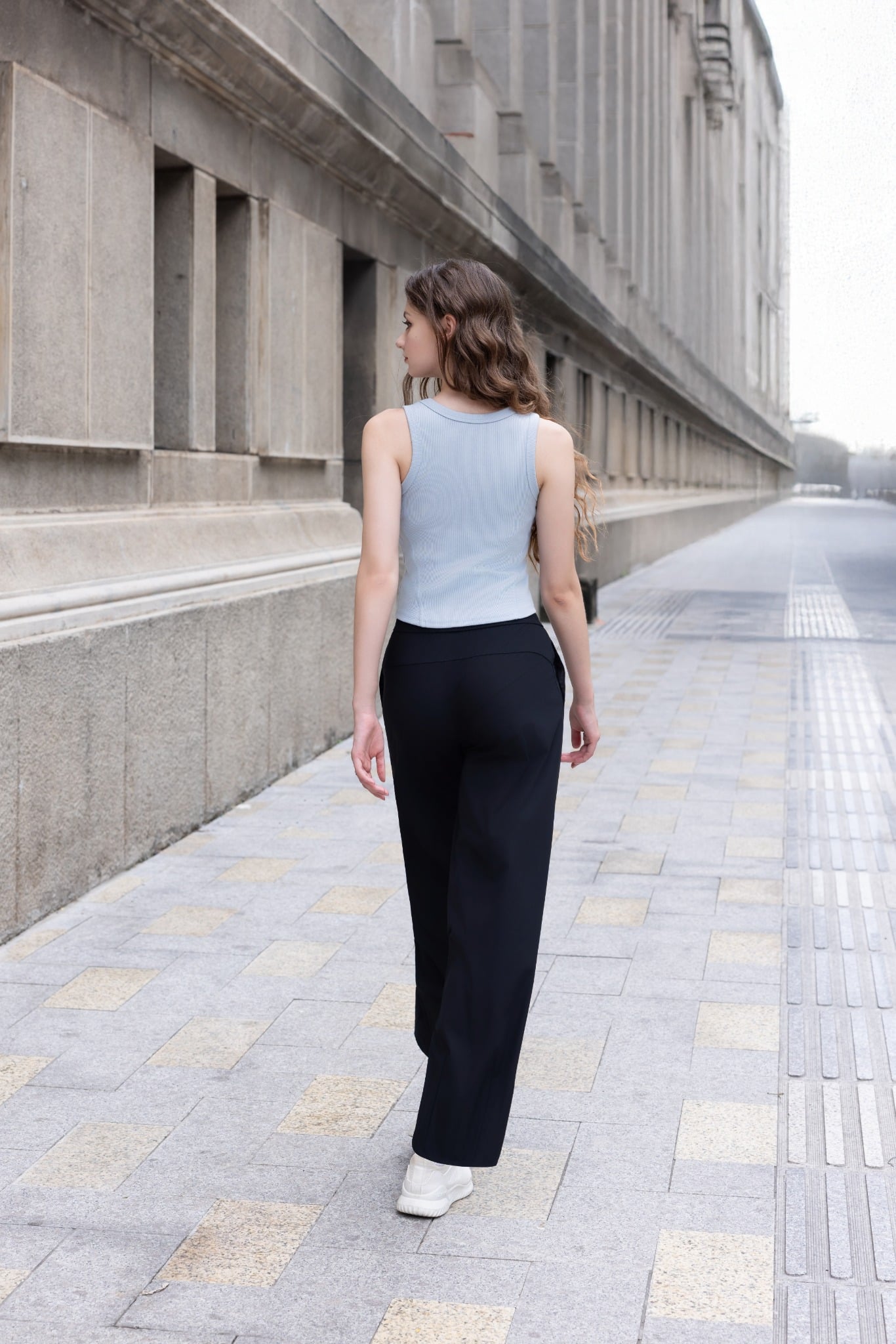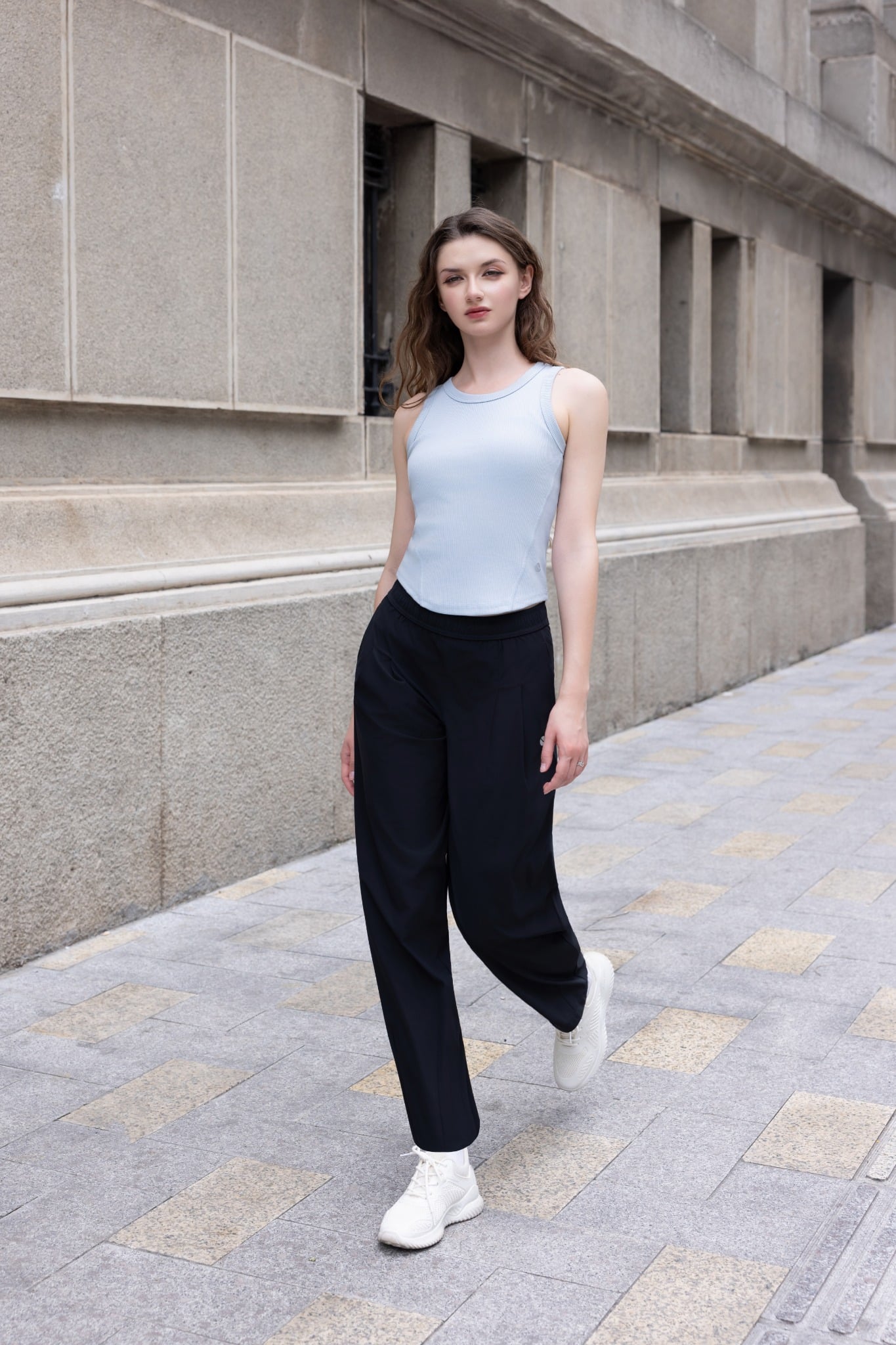Đi chơi: quần dài LV25W04F308 + áo croptop + sneaker → năng động, trẻ trung.