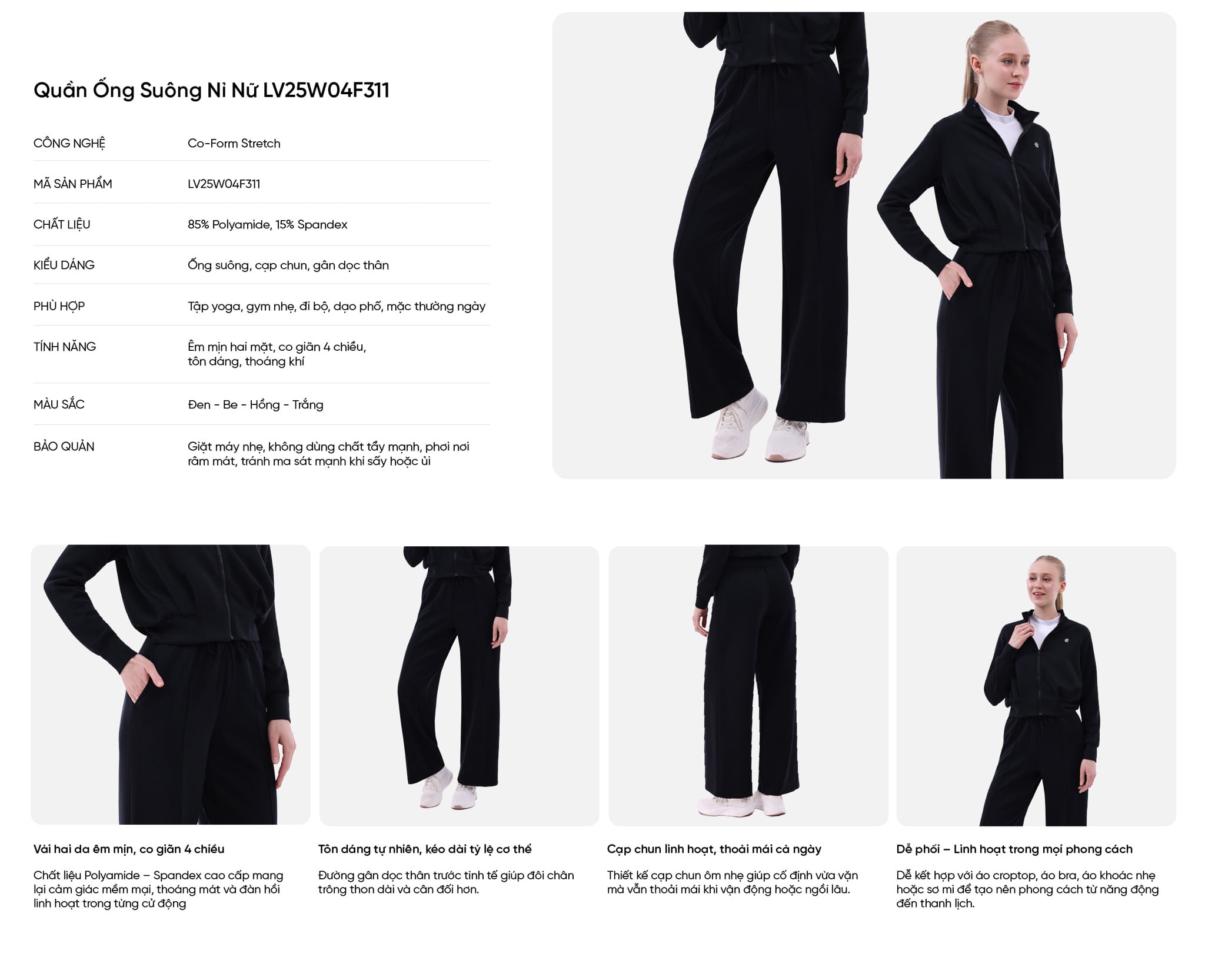Livan mang đến bảng màu đen, Be, trắng, Hồng , dễ phối cùng áo croptop, áo ngực thể thao hoặc áo khoác nhẹ để tạo nên phong cách riêng: