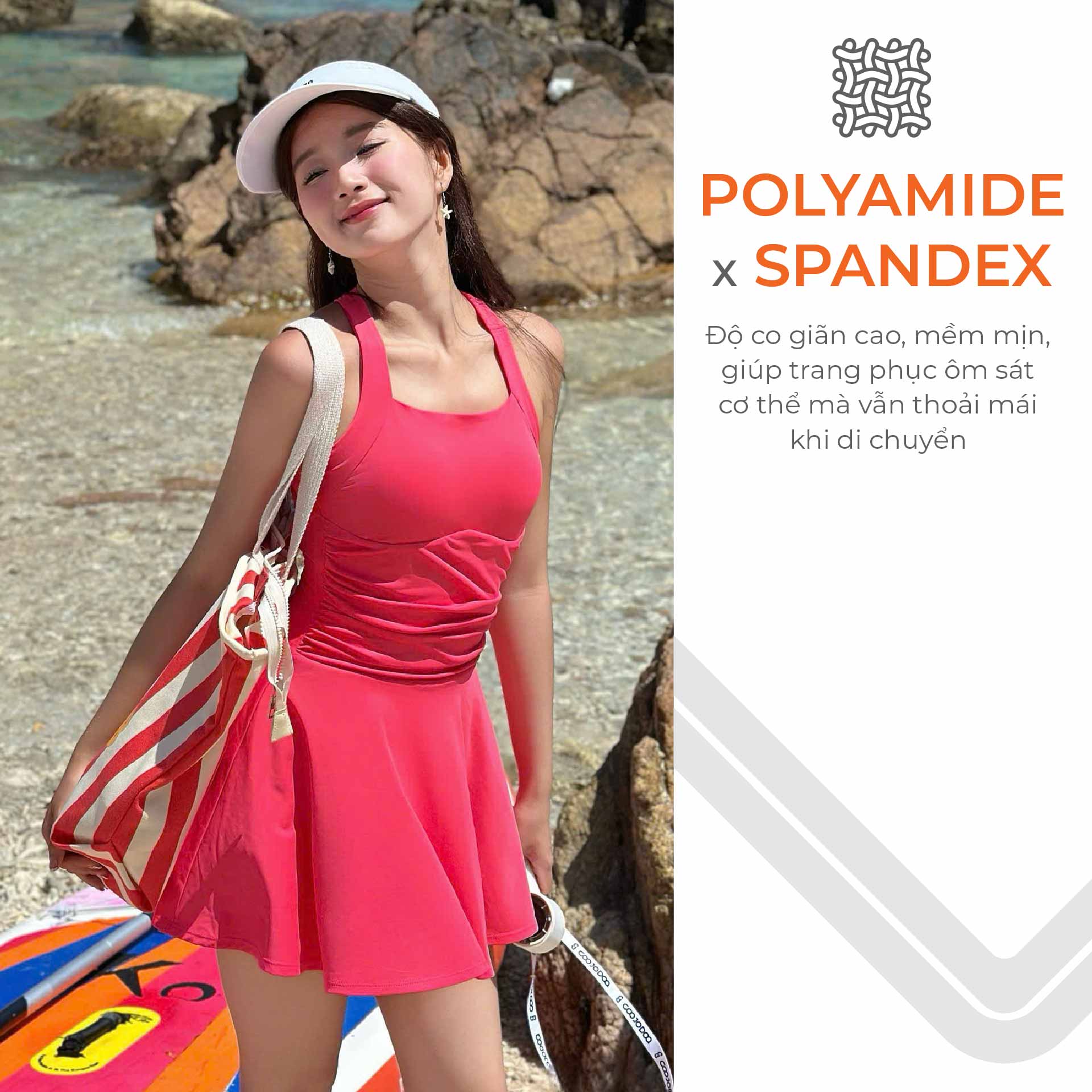 Polyamide + Spandex: Độ co giãn cao, mềm mịn, giúp trang phục ôm sát cơ thể mà vẫn thoải mái khi di chuyển.
